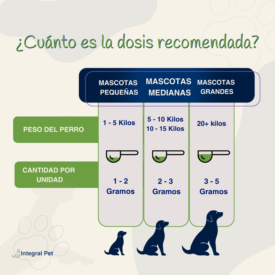 👉 Es muy fácil: solo mezcla el polvo con su comida diaria. La cantidad varía según el peso del perro: